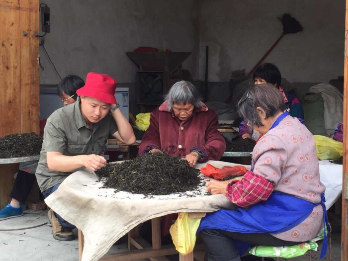 看!帅哥混进茶农阿嫲堆,装模作样地挑起茶来。