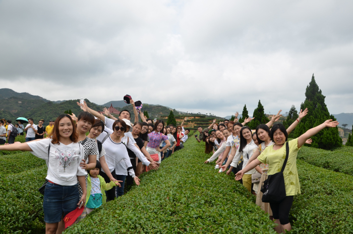 看到绿油油的大片茶海,所有人都喜笑颜开,展开双臂,拥抱大自然,沉浸在浓郁的茶文化氛围里。