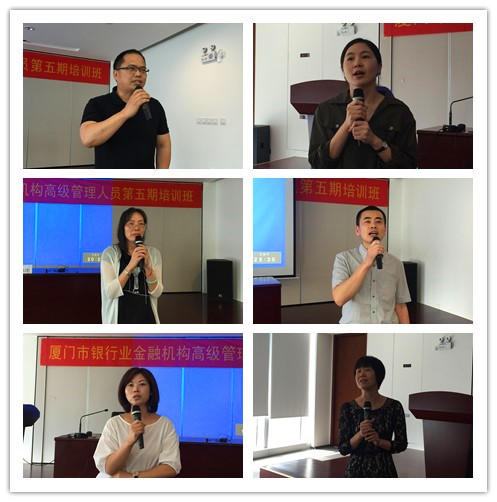 课程结束后,来自中国银行莲花支行的刘琼东行长,自贸区分行的卢冬群行长,民生银行国际山庄社区支行黄婷婷行长,邮储银行集灌营业所张雅双所长,招商银行集美支行洪勇国行长和工商银行镇海支行陈月鹤行长作为学员代表分别上台向在场学员、领导对两天的学习心得进行分享和汇报。