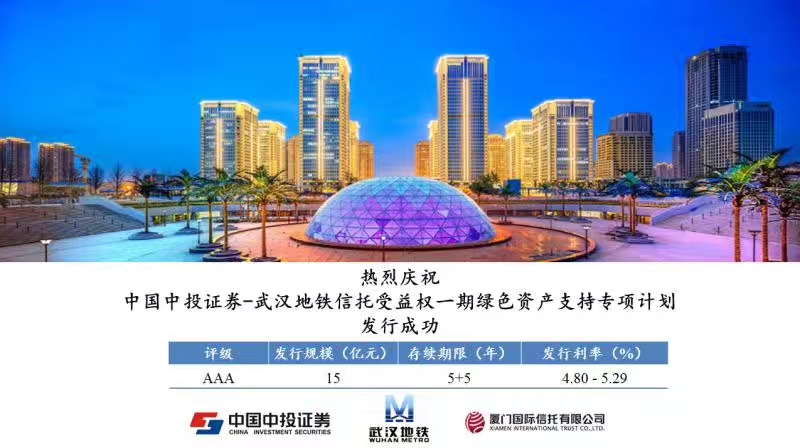 2017年7月18日,厦门国际信托参与的全国首单轨道交通行业的绿色资产证券化项目“中国中投证券-武汉地铁信托受益权一期绿色资产支持专项计划”成功发行,项目总发行规模共计15亿元,期限10年。本项目采用双SPV(特殊目的实体)架构,厦门国际信托为首层SPV的受托人。