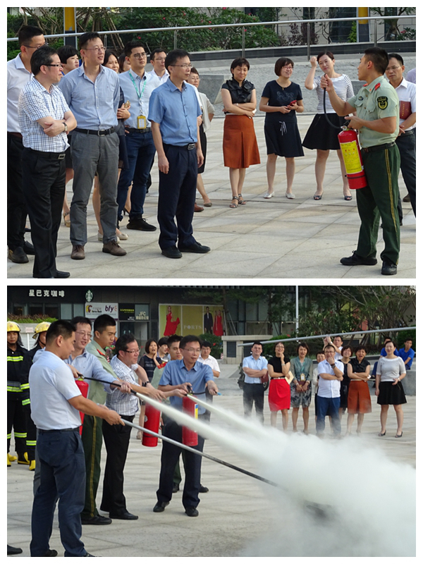 最后,全体参训人员来到IFC国际金融中心广场,冯教官详细介绍了干粉灭火器的灭火范围及使用技巧后,参训人员现场进行灭火器实操演练。