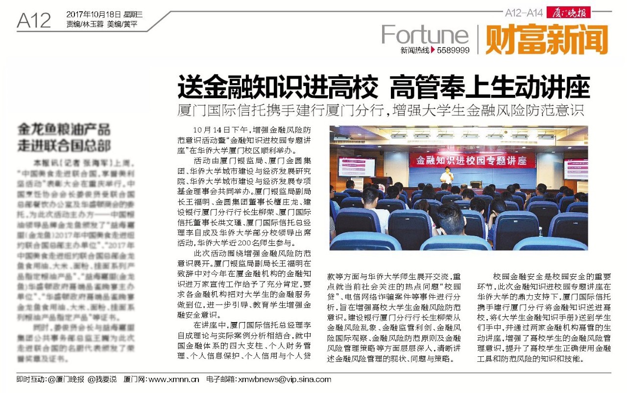 校园金融安全是校园安全的重要环节,此次金融知识进校园专题讲座在华侨大学的鼎力支持下,厦门国际信托携手建行厦门分行将金融知识送进高校,将《大学生金融知识手册》送到学生们手中,并通过两家金融机构高管的生动讲座,增强了高校学生的金融风险管理意识,提升了高校学生正确使用金融工具和防范风险的知识和技能。