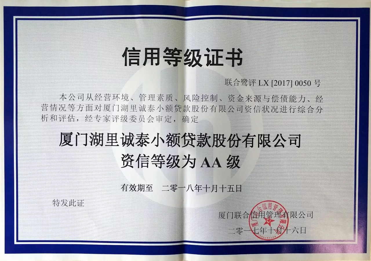 近日,厦门联合信用管理有限公司从经营环境、管理素质、风险控制、资金来源与偿债能力、经营情况等方面对厦门湖里诚泰小额贷款股份有限公司资信状况进行综合分析和评估,经专家评级委员会审定,确定诚泰资信等级为AA级。诚泰成为厦门市首家且是唯一一家资信AA级小贷公司。