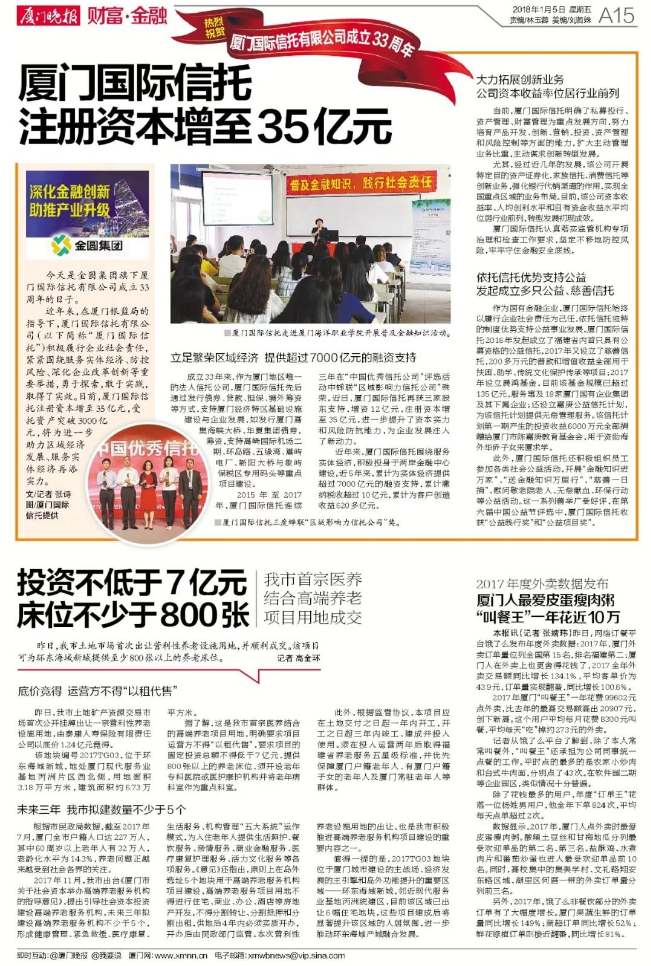 2015年至2017年,厦门国际信托连续三年在“中国优秀信托公司”评选活动中蝉联“区域影响力信托公司”殊荣。近日,厦门国际信托再获三家股东支持,增资12亿元,注册资本增至35亿元,进一步提升了资本实力和风险防抗能力,为企业发展注入了新动力。