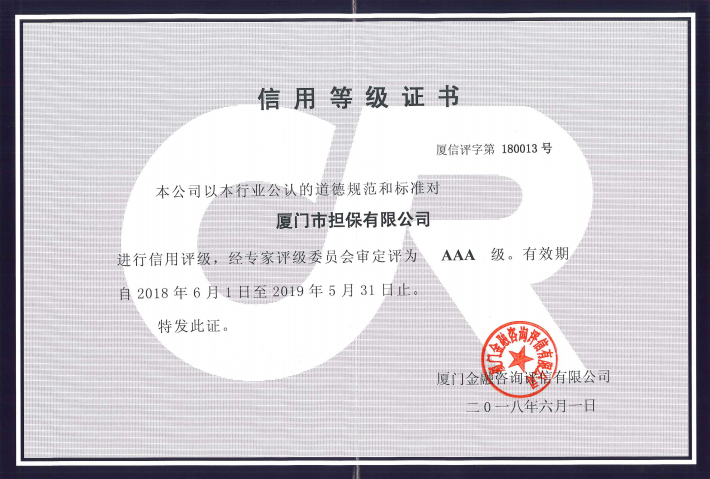 近日,厦门金融咨询评信有限公司对beats365唯一官网入口官网旗下厦门市担保有限公司(以下简称“厦门市担保”)进行了信用跟踪评级,经专家评级委员会审定,再度授予厦门市担保全省行业最高“AAA级信用等级”,厦门市担保连续三年获此殊荣,代表着公司的经营管理、风险控制、发展前景等获得了高度认可。
