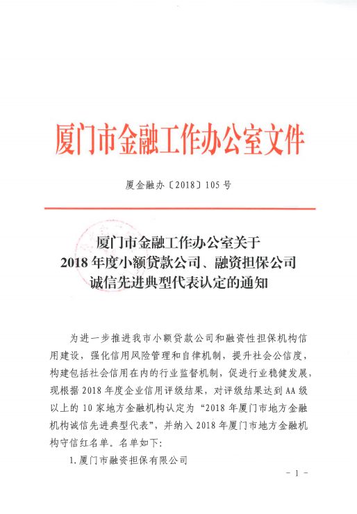 为进一步推进我市地方金融机构信用建设,强化信用风险管理和自律机制,提升社会公信度,构建包括社会信用在内的行业监督机制,促进行业稳健发展,厦门市金融办根据2018年度企业信用评级结果,对评级结果达到AA级以上的10家地方金融机构认定为“2018年厦门市地方金融机构诚信先进典型代表”,并纳入2018年厦门市地方金融机构守信红名单。