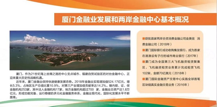 近年来,厦门金融业保持快速健康发展态势。2018年金融业实现增加值524.17亿元,增长5.3%,占地区生产总值比重10.9%,对第三产业增加值贡献率达14.2%。辖内银、证、保金融机构253家,其中法人金融机构17家,地方金融机构超过700 家,金融业总资产达1.8万亿元,形成功能完备、运行稳健的多元化金融服务体系,金融业现代化、国际化发展水平不断提高。