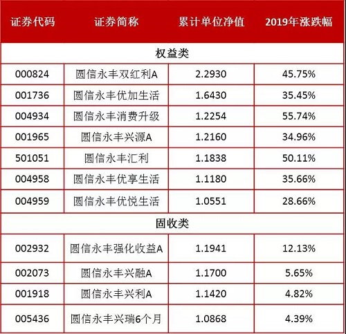 圆信永丰双红利(A 类 000824)成立于 2014.11.19,2014-2019各年度 A 类收益率分别为 10.40%、77.16%、3.96%、28.05%、-25.39%、45.75%;圆信永丰优加生活(001736)成立于2015.10.28,2015-2019各年度收益率分别3.00%、17.96%、24.53%、-19.83%、35.45%;圆信永丰消费升级(004934)成立于2018.03.22, 2018-2019各年度收益率为-21.32%、55.74%;圆信永丰汇利(501051)成立于2017.11.30,2017—2019年各年度收益率分别为1.27%、-22.13%、50.11%;圆信永丰优享生活(004958)成立于2017年8月30日,2017-2019年各年度收益率分别为3.73%、-20.55%、35.66%;圆信永丰兴源(A类:001965),成立于2017年6月21日,A类2017-2019各年度收益率分别为6.2%、-15.16%、34.96%;圆信永丰优悦生活(004959)成立于2018年1月29日,2018-2019各年度回报率分别为-17.99%、28.66%;圆信永丰强化收益(A类:002932)成立于2016年7月27日, A类2016-2019年各年度收益率分别为-1.5%、6.58%,1.17%、12.59%;圆信永丰兴融(A类:002073)成立于2015年12月21日,A类2016—2019各年度收益率分别为2.3%、1.91%、7.2%、5.65%;圆信永丰兴利(A类:001918)成立于2016年2月23日,A类2016-2019各年度收益率分别为1.2%、1.1%、6.85%、4.82%;圆信永丰兴瑞(005436)成立于2018年6月11日,2018-2019各年度收益率分别为4.3%、1.99%。投资人可登陆圆信永丰官网http://www.gtsfund.com.cn 查询各基金完整业绩表现。