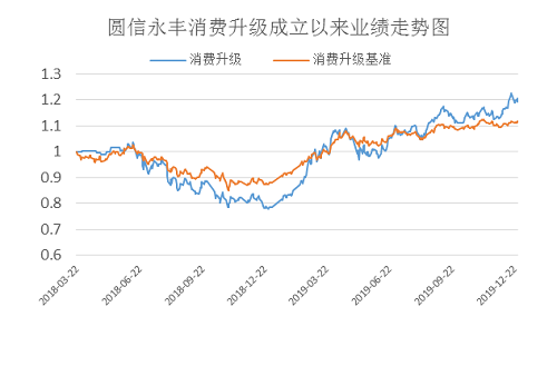 圆信永丰消费升级混合型基金是在2018年3月22日成立的,虽然2018年A股震荡下跌,本只基金的基金经理胡春霞女士在低指数位配置以较高的仓位配置优质的有竞争力的上市公司。2019年,圆信永丰消费升级取得了55.74%的收益率,超过业绩比较基准27.47个百分点(业绩比较基准28.27%),在主动混合开放型基金中位于前1/8。