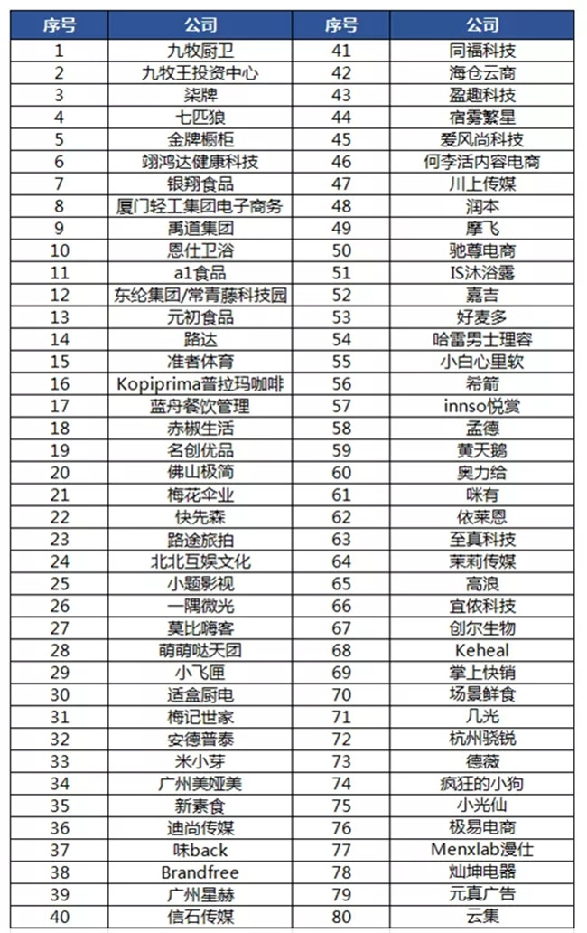 (注:表格中公司排序不分先后)