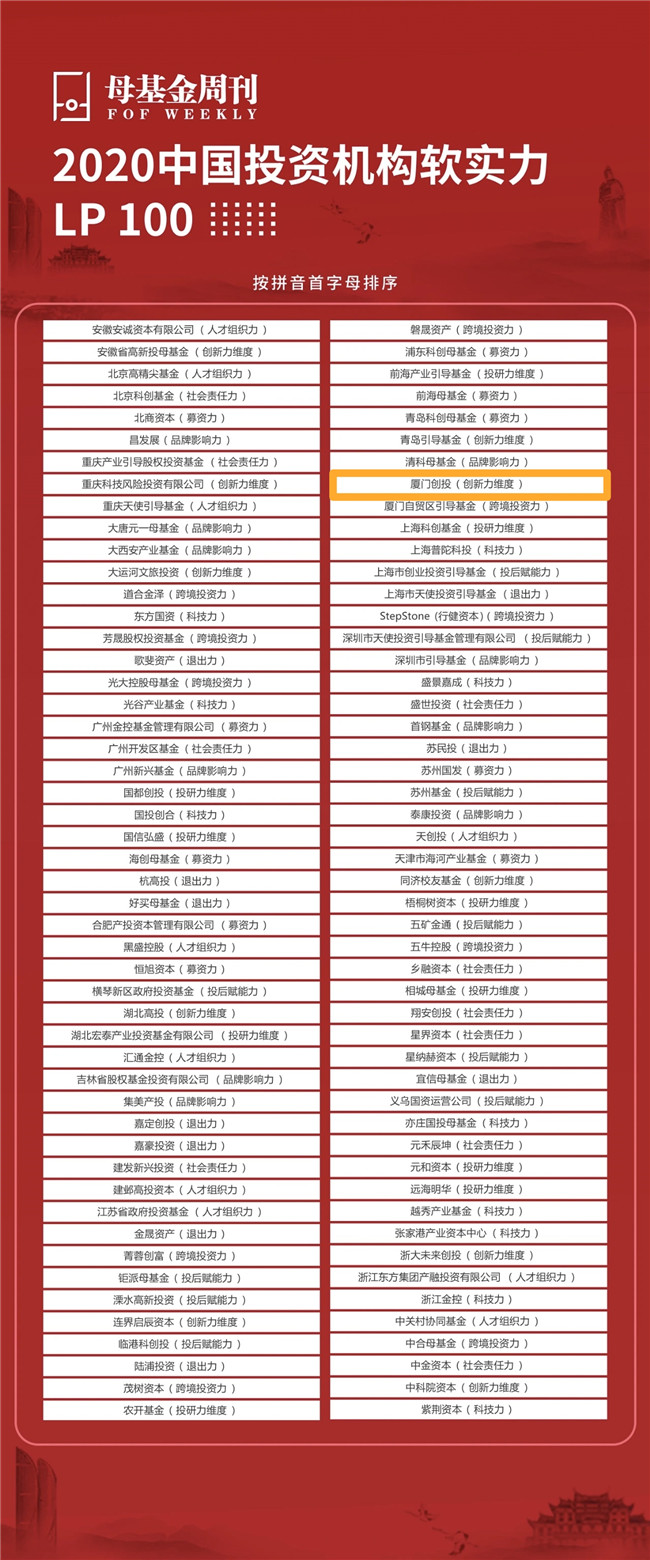 会后,《母基金周刊》发布了中国投资机构软实力100榜单,以表彰投资机构软实力先行者的实践。厦门市创业投资有限公司(简称“厦门创投”)荣获母基金周刊“2020中国投资机构软实力LP100 创新力Top10”。