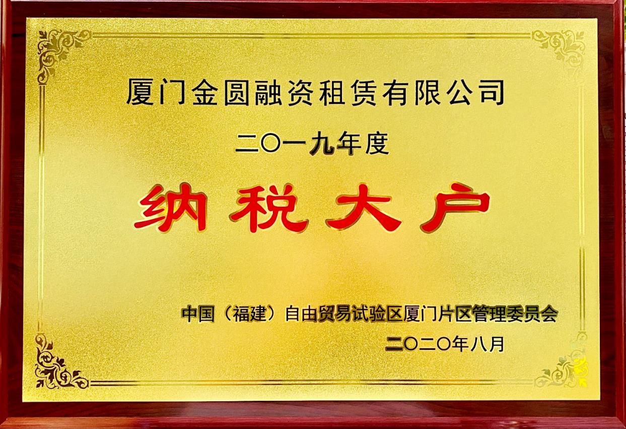 公司连续两年荣获厦门自贸片区管委会“纳税大户”称号,并在第14届中国融资租赁年会上荣获“2020中国融资租赁成就奖”称号。