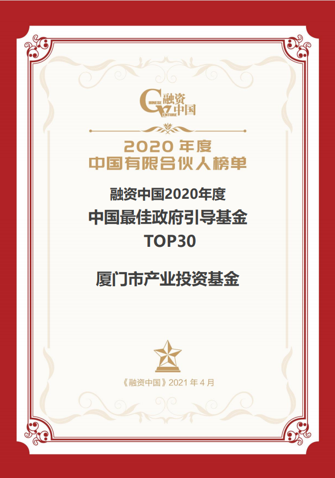 峰会于28日发布“融资中国2020年度有限合伙人榜单”,厦门市产业投资基金荣获“融资中国2020年度中国最佳政府引导基金TOP30”称号。