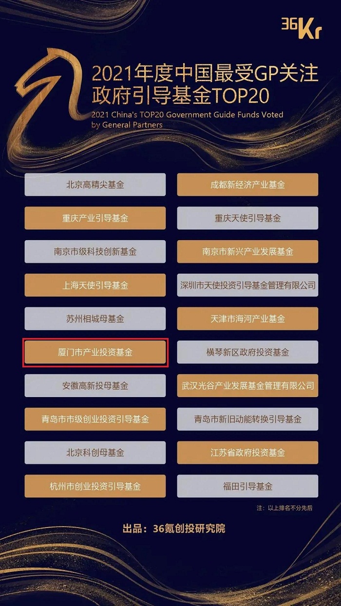 除2020投中榜外厦门创投受托管理的厦门市产业投资基金还荣获36氪创投研究院评选的“2021年度中国最受GP关注政府引导基金TOP20”