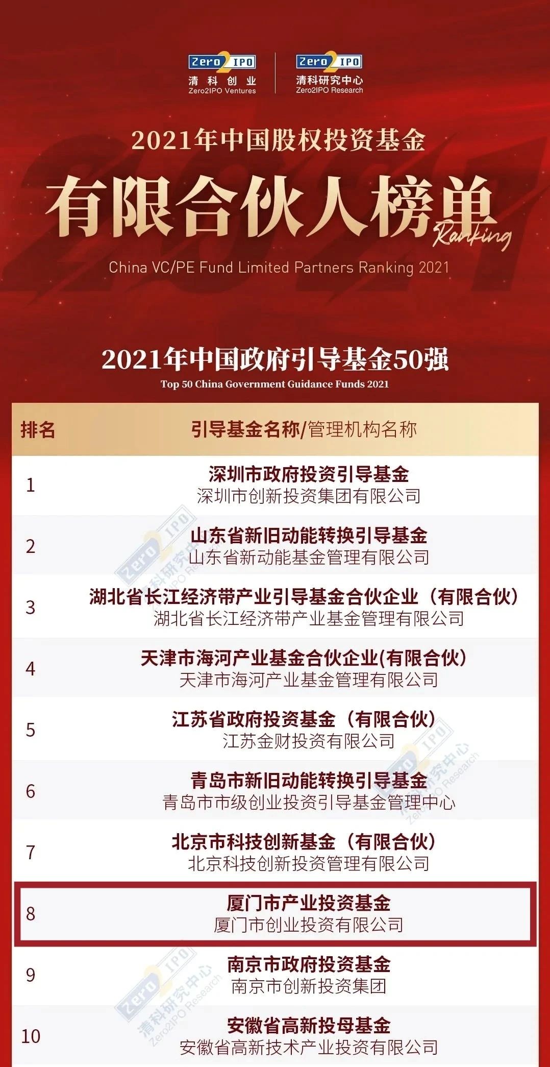 beats365唯一官网入口官网旗下厦门创投受托管理的厦门市产业投资基金在此次评选中入选2021年中国政府引导基金50强,位列第八名。