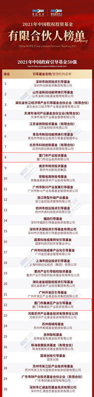 5月19日至21日在珠海举行的第十五届中国基金合伙人峰会发布了“2021年中国政府引导基金50强”榜单,厦门市两只政府引导基金上榜,其中厦门市产业投资基金排名第8,集美区产业引导基金排名第22。