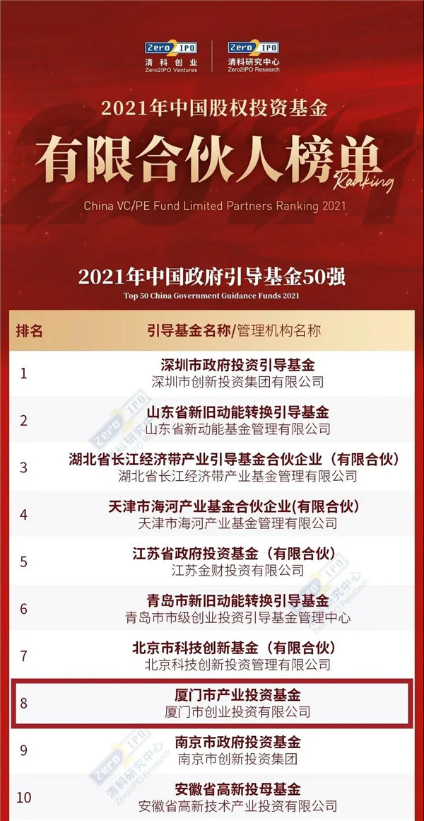 厦门创投受托管理的厦门市产业投资基金在此次评选中入选2021年中国政府引导基金50强,位列第八名。