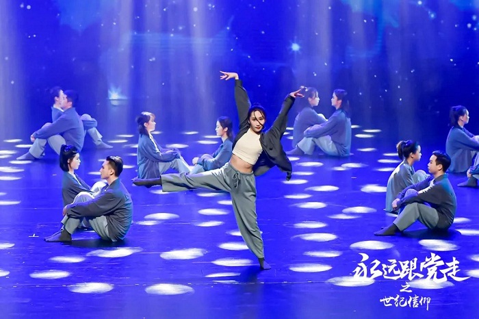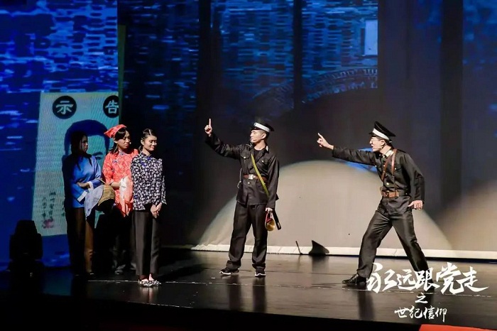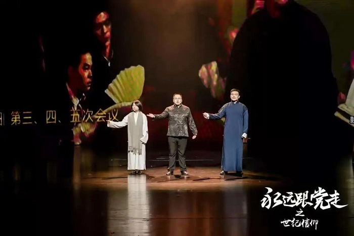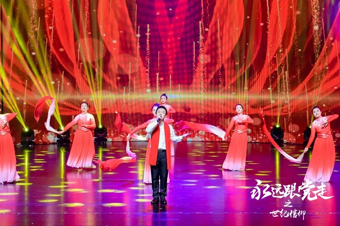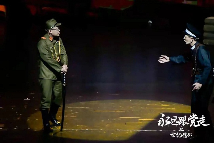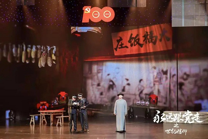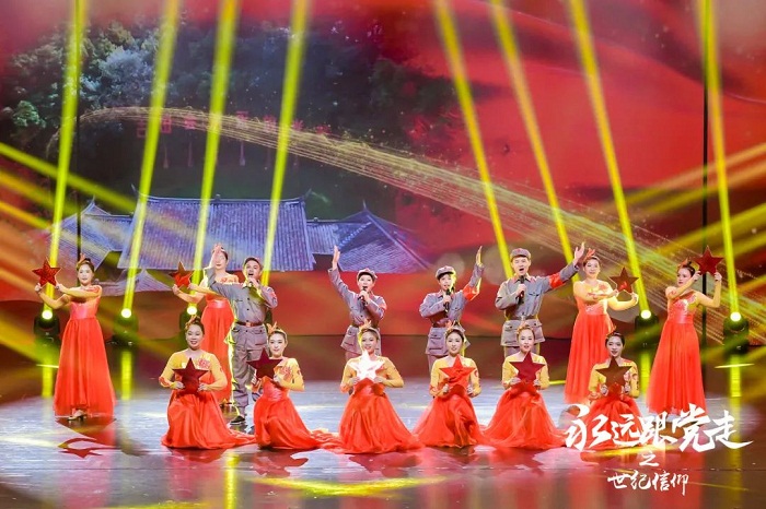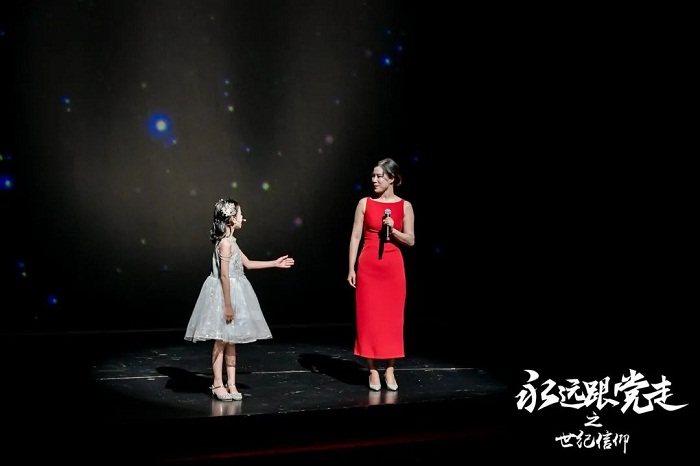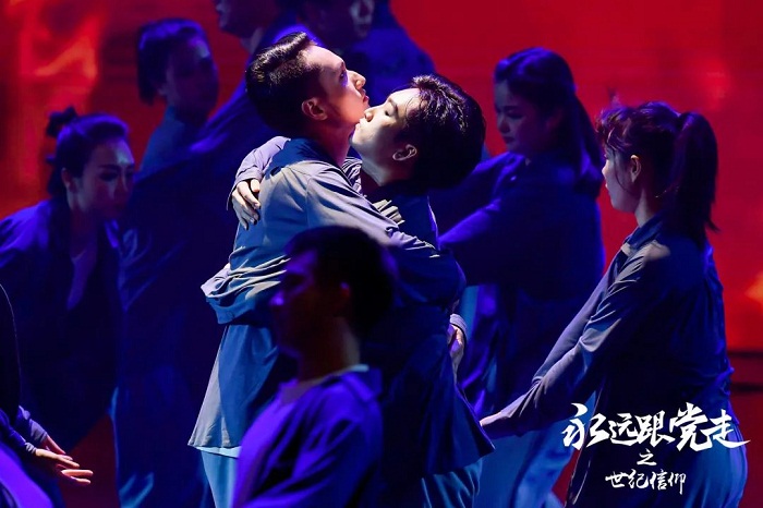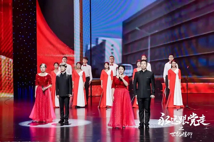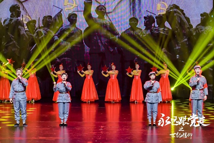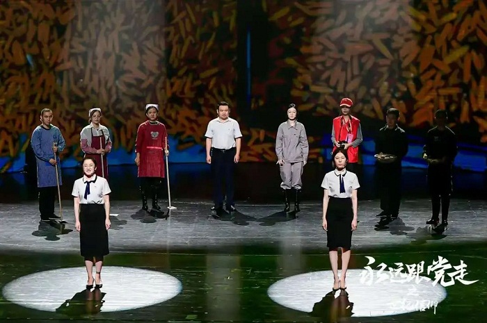 没有传统的报幕主持人,本次晚会采用戏剧“歌队”的创新形式,由13位故事“讲述者”作为串联载体,以“时间主线+音乐和服装副线”为引导,穿越百年时空,再现红色经典。
