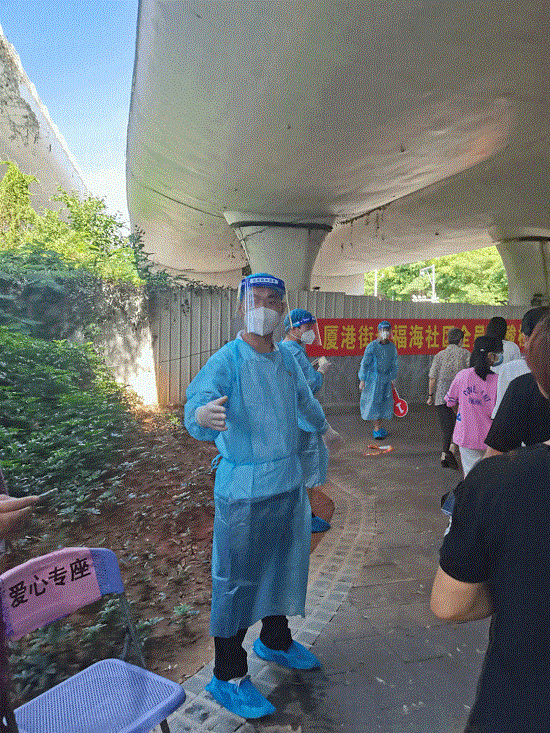 厦房担保的杨丁欢,主动报名社区志愿活动,在集美二小核酸检测点引导市民有序排队。