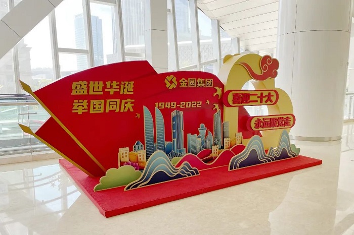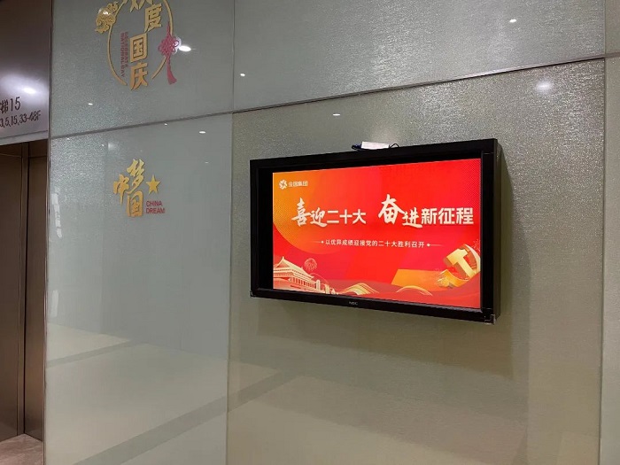 在厦门国际金融中心进行场景布置,一楼大厅LED大屏幕、各楼层电视滚动屏、集团OA内网和集团官网主页等不断流动播放“喜迎二十大 奋进新征程”的宣传标语,全面营造热烈、浓厚氛围。