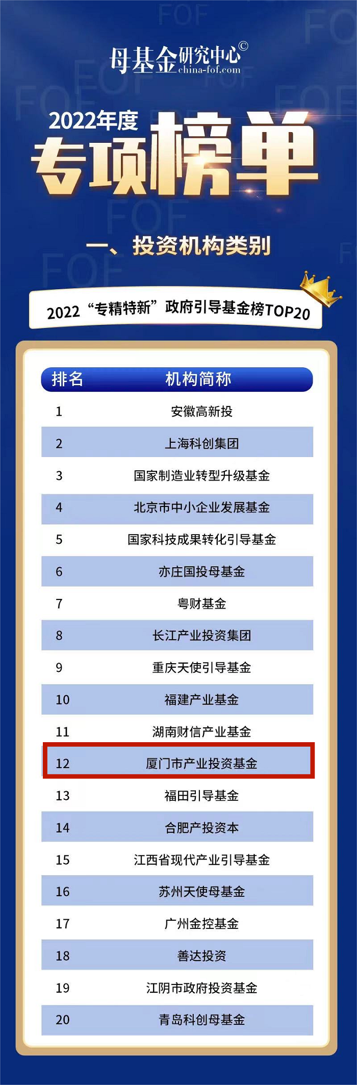 11月12日,2022母基金研究中心专项榜单揭晓,厦门市产业投资基金喜获2022“专精特新”政府引导基金TOP20。