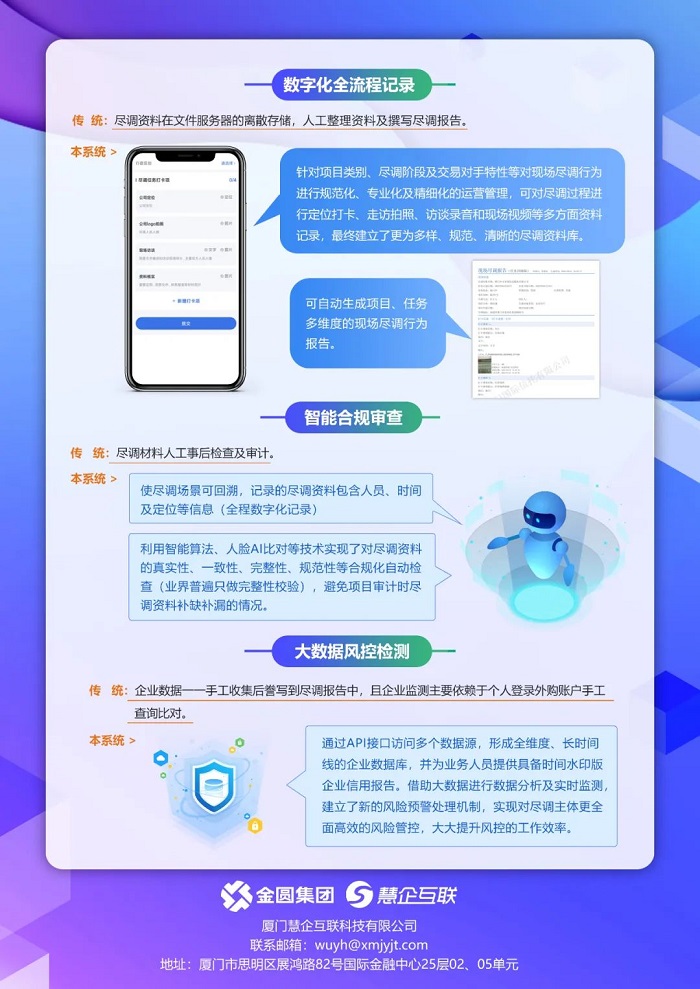 近年来,监管部门对尽职调查履职到位要求日益提高,不断出台相关文件对尽职调查提出规范要求。同时,随着金融行业的不断发展,规范、增强尽职调查特别是现场尽职调查工作,成为提升金融行业全面风险管理能力、促进金融机构转型升级的重要举措。现场尽调智能管理系统解决了部分金融机构尽职调查面临的流程规范弱、责任界定难、合规审查效率慢及数据保护安全性较低等问题。