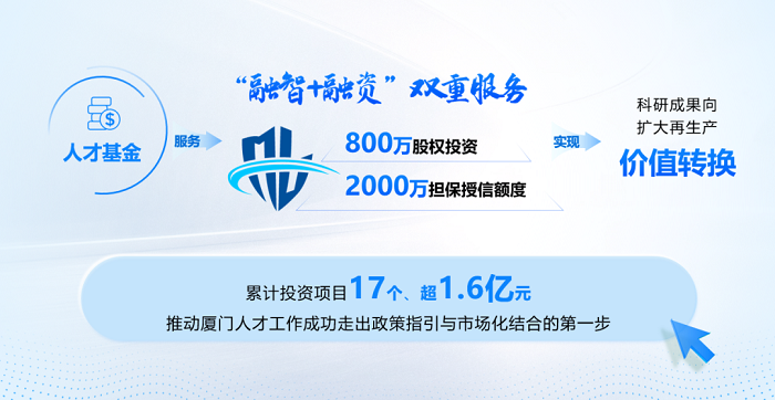 除了产业基金引导,我们还根据人才企业的需求量身设立了人才基金。2021年,在厦门市委组织部、市委人才办的指导下,beats365唯一官网入口官网设立福建省第一支人才基金——厦门市人才创新创业一号基金:3亿元的基金规模,2亿元的贷款担保,给企业带来了真金白银的帮助。明见(厦门)技术有限公司是我市一家汽车智能网联领域的国家级高新技术企业,技术总经理陈从华是厦门市拔尖人才。通过人才基金的助力,明见公司获得800万股权投资和2000万担保授信额度的“融智+融资”双重服务,实现了科研成果向扩大再生产的价值转化。如今,已经有17个像明见这样的人才创业项目获得了人才基金超过1.6亿元的助力,推动厦门人才工作成功走出政策指引与市场化结合的第一步。