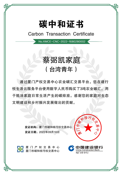 台湾青年蔡弼凯家庭就收藏着一份由厦门产权交易中心(厦门市碳和排污权交易中心)颁发的碳中和证书。去年9月,在厦门产权交易中心和厦门建行于翔安大帽山共同举办的“共建数字经济、践行绿色金融”活动上,蔡弼凯家庭通过购买农业碳汇,用于抵消家庭日常生活产生的碳排放,成为首次参与大陆农业碳汇交易的台湾青年家庭。