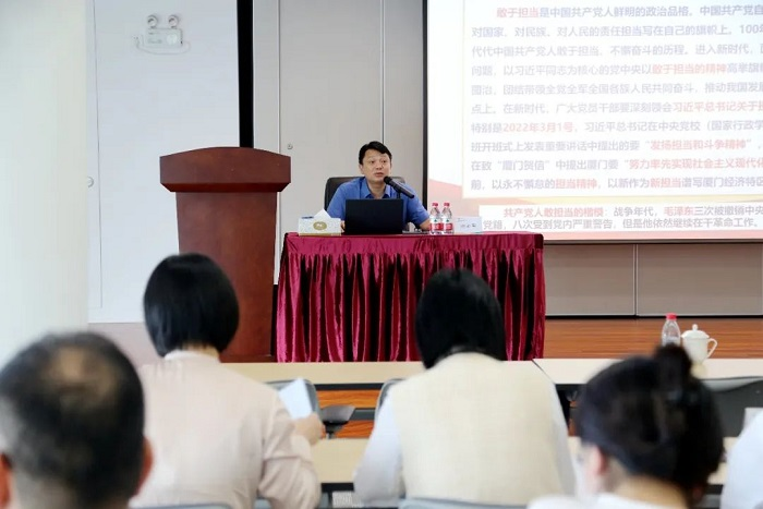 熊必军围绕《弘扬共产党人的担当精神,马上就办真抓实干》主题,引导大家牢记习近平总书记在致厦门经济特区建设40周年贺信中提出厦门要“努力率先实现社会主义现代化”的嘱托,以永不懈怠的担当精神勇毅前行,在厦门经济特区高质量发展的新篇章上展现新作为、彰显新担当。