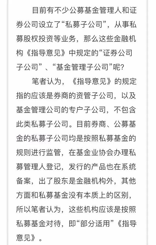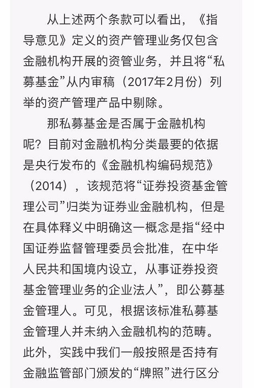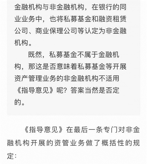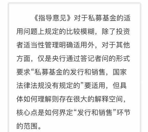 可见,从总体上来看,《指导意见》主要是针对金融机构资产管理业务而言的,对于非金融机构(主要是指私募基金)则仅是在最后一条作了一个概括性的规定,即需要“部分适用”,这一点在答记者问中也做了明确的说明。但无论是《指导意见》的规定,还是央行的解释都是非常模糊的,私募基金到底具体哪些需要适用和哪些不需要并没有明确。