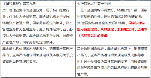 通过上述对比可以发现,央行的答记者问实际上对《指导意见》“国家另有规定的除外”作了一定程度的扩大解释!《指导意见》的原文是“非金融机构不得发行、销售资产管理产品,国家另有规定的除外”,而央行答记者问的解释除了最基本的字面意思之外,还增加了“国家法律法规没有规定的,适用本《指导意见》的要求”这一内容。