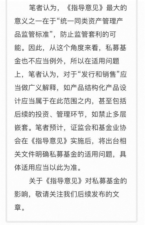 笔者认为,如果从央行“统一同类资产管理产品监管标准”的目的来看,私募基金和其他私募性质的资管产品无本质上的区别,那么就不允许私募基金有太大的差异,从而导致存在监管套利的可能性。所以,笔者倾向第一种理解,即 “发行和销售”是广义上的概念,包含了私募基金的所有环节。
