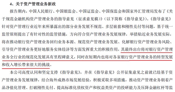 肯定资管新规的行业规范意义,同时表明短期会承压,体现在“转型发展”和“收入增长”两个方面。“转型发展”估计指的是在实行净值化管理和消除多层嵌套的过程中,银行理财业务的产品形态、投资组合管理模式、交易结构,以及配套的信息系统、人才引进等将面临调整;“收入增长”指的是资管新规对理财中间业务收入带来的负面影响,以往刚兑背景下留存超额投资收益的模式将难以为继。