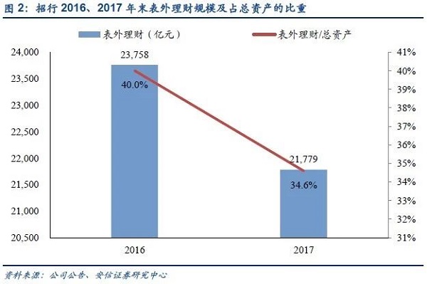 根据披露理财中收的上市银行2017年半年报的数据测算,银行理财业务贡献的中收平均占总体中收的23%,占营收的6%。2017年招商银行的受托理财收入同比下降21.05亿元,约占2017年营业收入的1%。