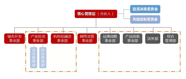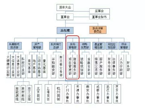 如下PE投资机构的业务组织结构图,其设立专职化的投后管理部门和团队 :