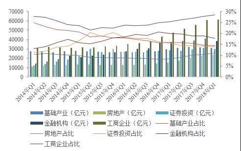 图8 2014年Q1—2018年Q1季度信托资产投向及其占比