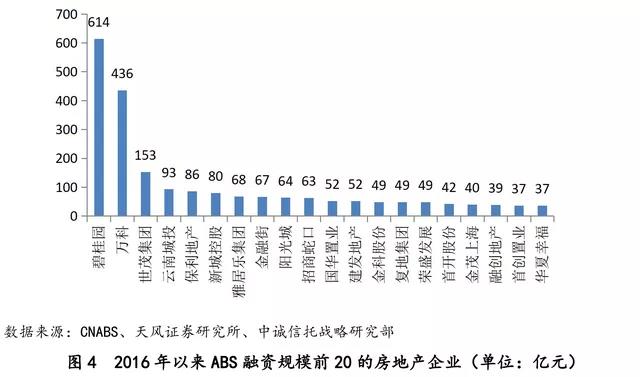 结合CNABS、天风证券研究所等数据来源,可以看到2016年以来,发行资产支持证券进行融资的房地产企业主要集中在排名靠前的大型房企。如碧桂园和万科,作为一线房企中的领军代表,两年多来已经通过ABS等方式融资超过千亿元远远超过其他房企。但同时也意味着,其他一线房企还有较大的资产证券化业务空间,值得充分挖掘。