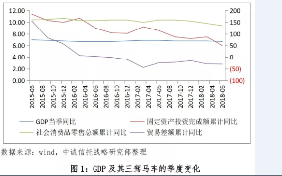 一是国内经济增长明显承压。受中美贸易战、国内去杠杆等因素的影响,2018年2季度国GDP同比增长6.7%,比一季度回落0.1个百分点。从需求动力看,投资、消费、出口三驾马车集体降速:上半年固定资产投资同比增长6.0%,比一季度回落1.5个百分点;社会消费品零售总额同比增长9.4%,回落0.4个百分点;货物进出口顺差9013亿元,比上年同期收窄26.7%。