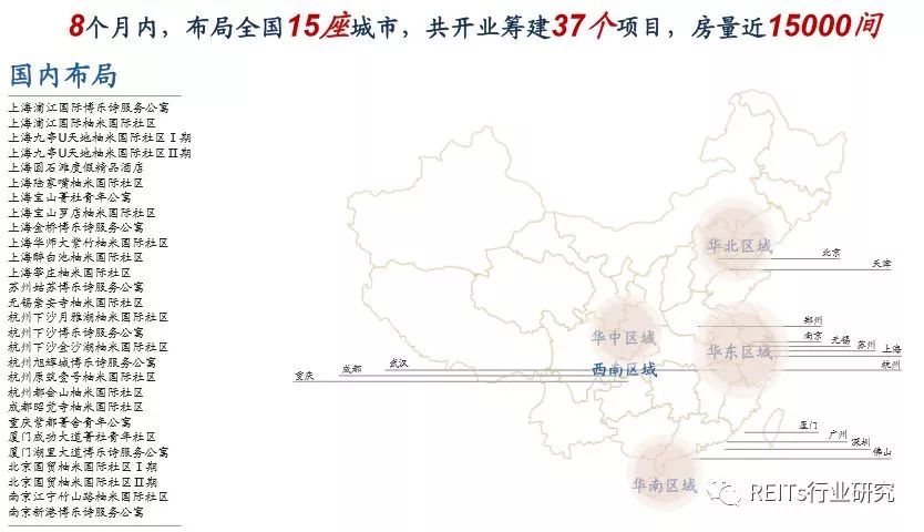 目前领昱运营上海浦江国际博乐诗服务公寓、上海浦江国际柚米国际社区、上海久亭纯真中心柚米国际社区、上海圆石滩独家精品酒店、上海浦电路柚米国际社区、上海宝样路菁社青年社区、杭州中豪七格博乐诗服务公寓、杭州中豪七格柚米国际社区、重庆紫都菁社青年社区等多个项目,主要分布于上海、重庆及杭州等地,2017年末总出租规模将达到2万间公寓。