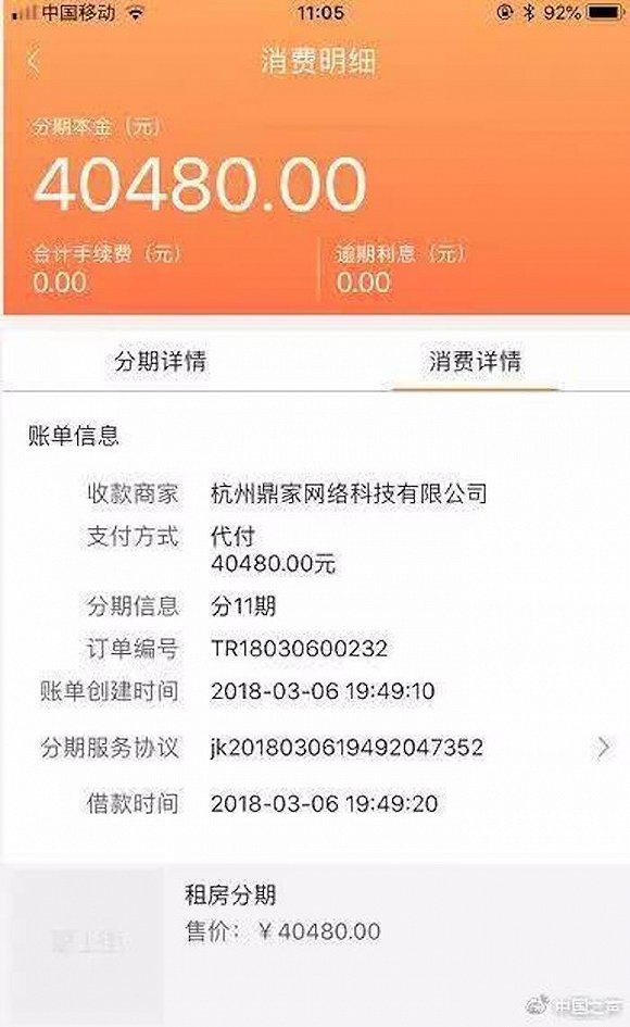 今年刚刚毕业的张女士在某长租公寓平台租住了一套房子,她本来计划只租一年,最终却签了两年的合同。张女士告诉中国之声记者:“我们来签合同的时候,他(中介)让我签了两年。其实我只想租一年,但他让我签两年的。到了付款的环节,他就让我签第三方的租赁分期平台,当时我不知道它是租赁分期平台。中介说,如果选择按月付的方式,而且是押一付一的话,就得签这个平台。我问这个平台是做什么用的,中介说就是负责收款的,每个月往里面打钱就好。”