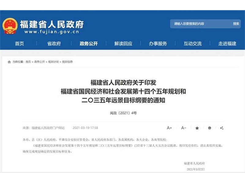 近日,《福建省国民经济和社会发展第十四个五年规划和二〇三五年远景目标纲要》重磅出...