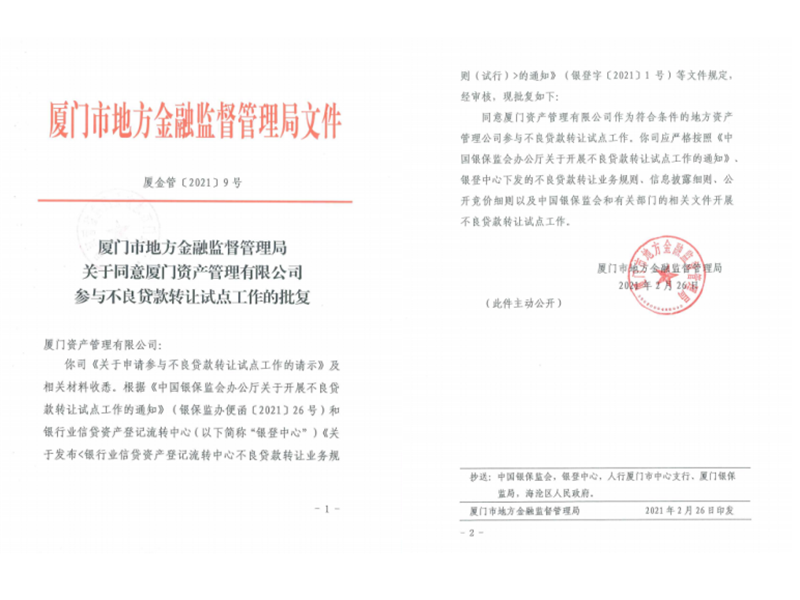2021年2月26日,厦门资管获得《厦门市地方金融监督管理局关于同意厦门资产管理有...