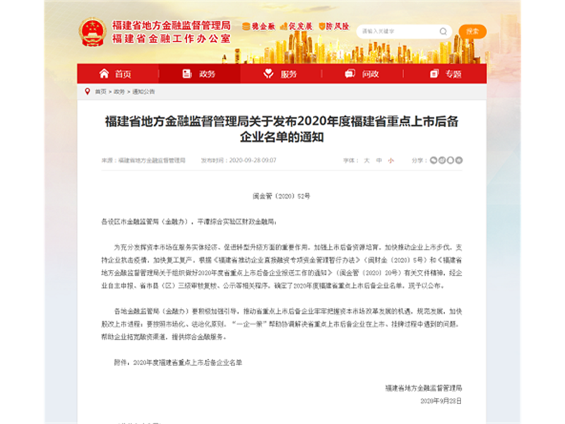 9月28日,福建省地方金融监督管理局发布《2020年度福建省重点上市后备企业名单的通知》...