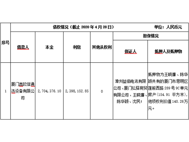 厦门资产管理有限公司拟将持有的厦门鑫欧信通迅设备有限公司不良资产公开处置。 本...