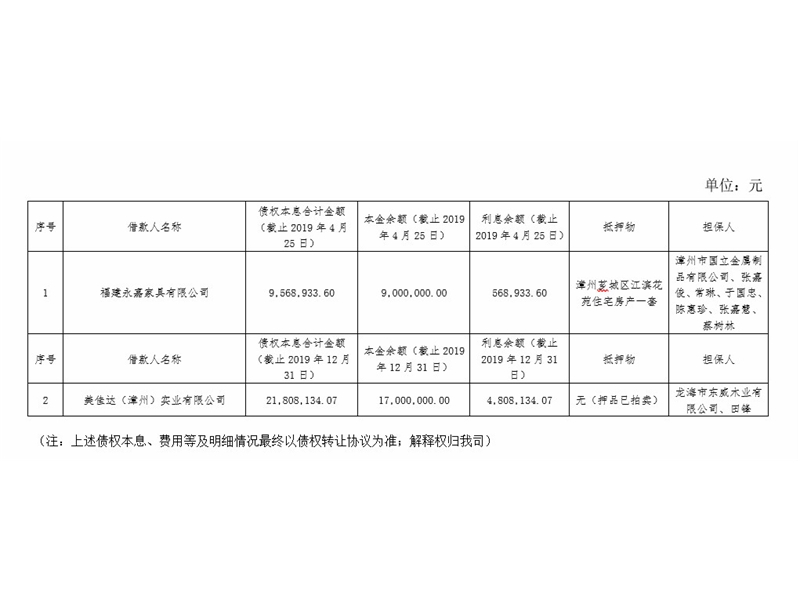 我司拟对名下持有的福建永嘉家具有限公司等2户不良债权资产进行公开处置,特此公告。本...