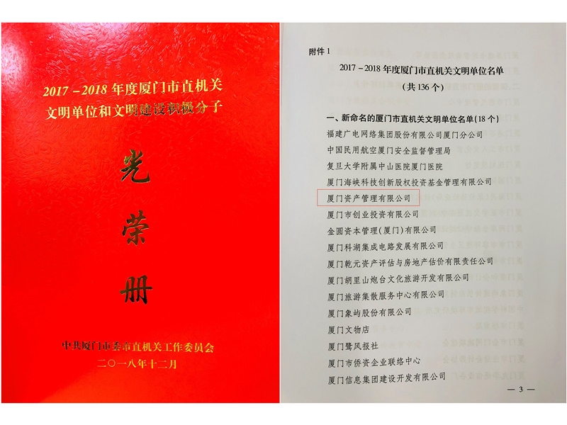 日前,厦门资产管理有限公司喜获2017-2018年度厦门市直机关“文明单位”荣誉称号。 ...