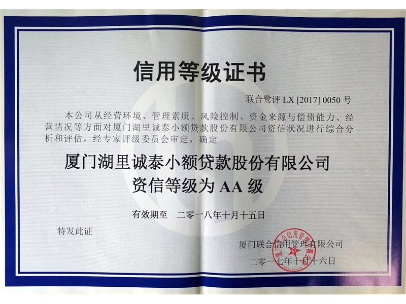 近日,厦门联合信用管理有限公司从经营环境、管理素质、风险控制、资金来源与偿债能力...