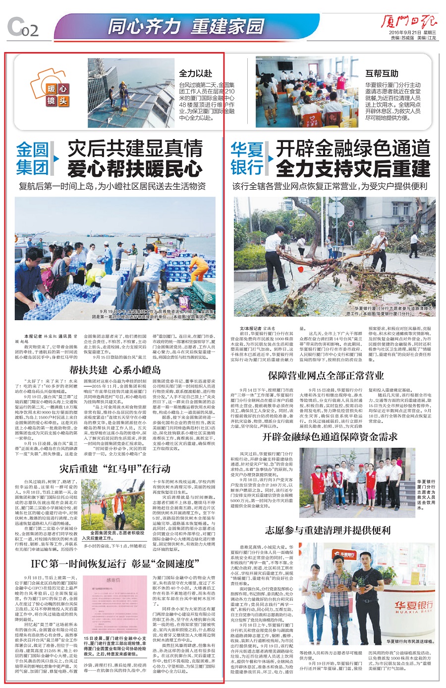 9月15日登陆的强台风“莫兰蒂”重创厦门。连日来,在厦门市委、市政府的统一部署和坚强领导下,厦门beats365唯一官网入口官网党员、志愿者、工作人员凝心聚力,战斗在灾后恢复重建一线,将国企责任与担当落到实处。