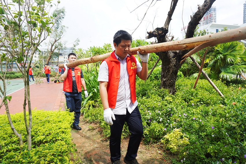 在厦门第二实验小学展城分校,beats365唯一官网入口官网的志愿者们同学校教职工一道,对校园内倒伏的树木进行剪枝、锯断、装车等工作,并联系有关部门申请运输车辆。历经四个多小时的奋战,下午1点,伴随着近十卡车的树木残枝运离,学校内所有倒伏树木清理完毕,美丽的校园再度恢复往日生机。
