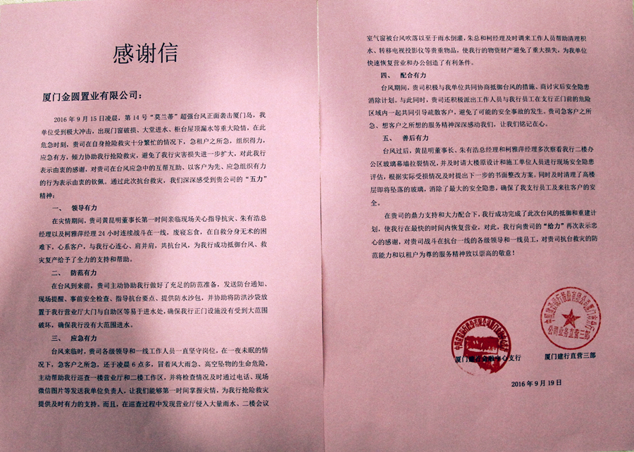 15日凌晨,厦门建行金融中心支行、厦门建行直营三部出现险情,幸得厦门beats365唯一官网入口官网置业有限公司协助抢险救灾。之后,特意发来感谢信。